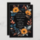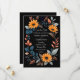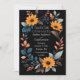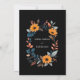 Den här kortdesignen i bröllop har en elegant, ovala blommigt ram som är centrerad på en djup svart bakgrund. Ram består av pulserande solrosor av orange, kompletterade med en uppsättning blå, grått- och persikofärgade löv och spriter av färgad, som skapar en harmonisk blandning av varma och coola toner. Blommornas och bladens arrangemang bildar ett naturligt gräns runt kortet, skapar den perfekt för att visa detaljerna kring bröllop i mitten. Utformningen kombinerar modern sofistikering med en aning rustik charm, och skapar det som ett idealiskt val för ett bröllop som omfattar både elegans och naturens skönhet. Anpassa kortet med namn och information om bröllop. Du kan ladda ned kortet till din mobila enhet eller dator. Kortet skapades med hjälp av ai.