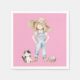 Rosa Serviette mit Mädchen, Katze und Korb mit Eiern.