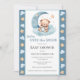 Söt Vi är över Måne! Björnduschinbjudan med nalle på blå moln och omgivna av stjärnor och moln med sött ansikte. Den här designen har gjorts i mjuka vattenfärger och är perfekt för pojke-babyduschen.