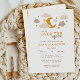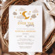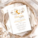 Under måne-babyduschinbjuden med ett typiskt känslotema skapar det ett charmerande sätt att fira en ny ankomst. Den här neutralten i gender har en gyllene måne omgiven av mjuka beige och taupmoln, accentuerad med gyllene stjärnor för en drömmande atmosfär i himmel. Den moderna typografin omfattar en lekfull blandning av fet serif och handskrivet skript typsnitt, skapar formuleringen med snyggtens elegans. Perfekt för en babydusch med en mjuk, neutralt palett. Den här designen balanserar sofistikering med en mysigt, välkomnande vib som tilltalar föräldrar som söker en modern men hjärtfull inbjudan till stil. Finns som tryckta kort eller en snabb digital nedladdning.