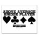 Du är en överbryggare bryggspelare, eller hur? Visa din inställning till bryggan med den här bron humor gummi frimärke med det vanliga talesättet på bron bord "Ove Average Bridge Player Inside". Kommer med det fyra kortet kostym. Få andra att göra en dubbla av hur väl du spelar bro/duplicera bro med denna tidlösa broattityd gummi frimärke!