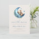 Den här söta babyduschinbjudan har en söt vattenfärgssovande nalle på ett blått halvmånsfärgat måne som dekoreras med blåa blommor, ovanför ord "över måne" i blåhandskript. Anpassa texten med namn i skript som ska skrivas mamma och detaljerna i sans serif-teckensnitt på en beige bakgrund. På baksidan finns utrymme för blöjraffel, bokar för baby och registerinformation, tillsammans med ett bekvämt QR-kodgäster som kan söka igenom registret. Perfekt för en pojkes babydusch.