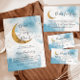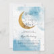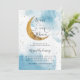 Dreamys inbjudningskort för babydusch med vattenfärgsbilder från blå himmel med faux guld måne och stjärnor. I texten står det "vi är över måne".