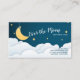 Ett halvmåne måne är bundet med en sträng mot ett nattligt himlar ovanför flytande vita moln. Golden stars paprigar bakgrunden till kobolt natt himlar i ett belysande stil. Underbar för ett baby-centrerat företag som detaljhandel med baby och barnkläder, barnomsorg, barndaghem, planerare i party, barn eller andra liknande företag för baby och barn. Finns med matchande artiklar.