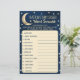 Det här "över måne"-spelet är perfekt för alla som har en barndusch i år. Utformningen har ett gyllene måne med stjärnor på en marin blå vattenfärgsbakgrund och är enkel att anpassa mallformuleringen. Bara ge, det här spelet lakan ut till dina gäster för att leka vid duschen, vem som än först oskadliggör ord, vinner ett pris som du själv väljer! Svar: 1) blöjor 2) Babyskor 3) (Wipes 4) (Nursery 5) Blanket 6) Nappar 7) (enkelsidig 8) Swaddle 9) Aktivitet Mat 10) Ether 11) Bassinet 12) Flaska 13) Rattle