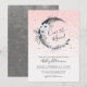Över månen Baby Shower-inbjudan. Fira ett magiskt ögonblick med detta fantasifulla bohemiska himmelska tema för baby shower. "Över månen!" visas framträdande inom en halvmåne på en rosa till vit gradientbakgrund, som kan anpassas till valfri färg. En elegant men lekfull look med en akvarellhalvmåne, gyllene stjärnor och vita anemoneblommor, fjädrar och andra accenter som ger en bohemisk känsla. Baksidan har en grå stjärnklar natt i akvarell. Designen visar upp en rosa, svart, vit, guld (inget glimmer eller folie) och grå färg överlag. Texten presenteras i en elegant blandning av script-typografi och ett serif-teckensnitt i svart. Denna inbjudan är perfekt för att fira den blivande mamman och lägger till en mystisk touch till din speciella dag. Enkel Stilren Elegant Akvarell