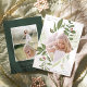Elegant julkort för vertikala foton med din bild omgiven av en geometrisk ram med frodig grön botanisk växtlighet och små röda akvarell-julbär. "Himlen och naturen sjunger" visas i övre vänstra hörnet med grå bokstäver, med ditt efternamn i nedre högra hörnet. Anpassa baksidan med ytterligare två foton och ett personligt meddelande.