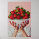 En slående hyperrealistisk målning av en skål som flödar över med färska, levande jordgubbar som hålls av ömtåligt händer med pulserande rött nagel. Den mjuka bakgrunden till rosan och de vita fläckiga sleeverna skapar en harmonisk kontrast, vilket förbättrar fruktens lustiga röda nyanser. Den här teckningen fångar det väsentliga i överseende och skönhet i en visuellt bedövande sammansättning.