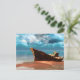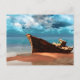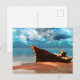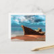 AI-genererad konst på ett vykort. En rostig gammal förfallen båt strandad på en sandig öde strand.