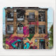 Övergivna byggnader i städerna med rosa och blå graffiti gatekonst som faller ner och förföll. Efter apokalyptisk.