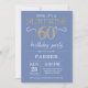 Överraskad 60:e födelsedagsinbjudan med blå bakgrund och Glitter-bakgrund i Guld. Chalkboard. Vuxen födelsedag. Manar eller Women Bday Inbjudan. Vilken ålder som helst.