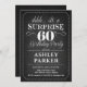 Överraskande 60 Födelsedagsfest inbjudan. Enkel klassdesign med svartfärgat skript mönster och vitt skript. Överraskad dag firande för man eller kvinna. Kan anpassas till vilken ålder som helst!
