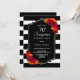 Svart och vit strimlad överraskning 70:e födelsedagsfest inbjudan med elegant röd och orange blommigt visning. Anpassadet är fullt ut för att du ska kunna inkludera all din egen information för födelsedagsfirandet.