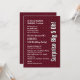 Denna moderna design med sin vinröda stjärnbakgrund är ett elegant sätt att inbjuda dina gäster till en ÖVERRASKNINGS-femtiårsfest. All text är helt anpassningsbar. Du kan ändra textfärgen för ett annat utseende. Även om denna design visas på ett vanligt papper rekommenderar jag det premiumfärgade metalliska papperet med isnyans, som ger dina inbjudningar en festlig glans och lyster.