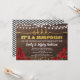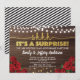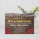 Elegant röd ros och gyllene överraskningsfest inbjudan med strängljus design på rustik träd bakgrund. Klassisk, feminin och glamourös.