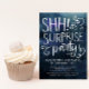 Elegant inbjudan till överraskningsfest för vuxna med marinblå vattenfärgsbakgrund och vit text som säger "Tyst! det är en ÖVERRASKNINGSFEST" med virvlar. Anpassa den här mallkortet genom att lägga till din egen festinformation.