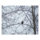 Ett foto av Örn på en träd-gren som undersöker området. Bilden skapades på vintern. Löven har lämnat träd och grenar samlar klumpar av snö. Ett par snöflingor-korn faller över örnns fjädrar. Himlar är molntäcke. Upphovsrätt ©2021 Kimberly J Tilley.
