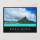 Fotovykort från en lyxdrubb som övervattnade tak-bungalow-resort i den blå turkoshagunen på den tropiska pacifistiska ön Bora, nära Tahiti i Fransk Polynesien med en vit text på Mt. Otemanu på ön i en svart låda: "Bora Bora, Fransk Polynesien".