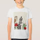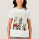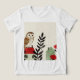 The image is a watercolor illustration of an owl and a bird sitting on the roofs of houses, with flowers and leaves between them.