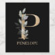 Brev P monogram blommigt. Brev P i guldbrunt struktur accentuerat med grönt vattenfärgade löv, blommor och blommar från guld. Personlig med namn i matchande teckensnitt.