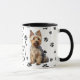En australisk Terrier-Hund sitter på två sidor av mugg. I texten mellan två bilder står det: "På den åttonde dagen skapat Gud AUSTRALIAN TERRIER och kallade det MYCKET BRA." Hund och den vita ovalsbanderollen som innehåller texten fält placeras på en vit bakgrund med svart tass avtryck.