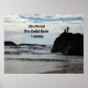 Scenisk syn på den bergiga Stilla havet Kusten, med ett silhuetter av människor som står högt upp på sten, med vinkara kraschar överallt. Budskapet lyder: "På Kristus Sten står jag."