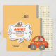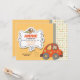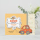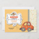 En förtjusande inbjudanvisning en liten flicka som kör en bil och vinka. En dekorativ panel med en brun fågel rymmer party information.