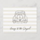 “På väg till kapellet” spara datum vykort med en söt handritad bröllopsbilsillustration med en rolig, färgrik randig bakgrund. Denna moderna men ändå romantiska design blandar minimalistisk linjekonst med lekfull färg, perfekt för att tillkännage ditt bröllop på ett stilfullt och minnesvärt sätt. Idealisk för par som älskar en fräsch, konstnärlig och modern bröllopsestetik samtidigt som de behåller en tidlös, kärleksfylld känsla.