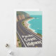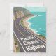 This clean, graphic illustration highlights the Pacific Coast Highway from an elevated viewpoint, with the road’s bold lettering integrated directly into the curve of the asphalt. Bright lane markings guide the eye alongside turquoise ocean waves, a sunlit beach, and rugged coastal cliffs. Flat shapes, balanced colors, and a poster-inspired style create a striking travel artwork that celebrates exploration, iconic scenery, and the timeless appeal of California’s legendary coastal route.