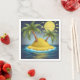 The image depicts of a small tropical island with two palm trees. The island is in the middle of a body of an ocean or sea, under a clear sky with the sun setting or rising in the background. The colors are vibrant, with yellow sand, green palm leaves, blue water, and a gradient sky from blue to yellow around the sun. A imagem mostra uma pequena ilha tropical com duas palmeiras. A ilha está no meio de um corpo de água, um oceano ou mar, sob um céu limpo com o sol se pondo ou nascendo ao fundo. As cores são vibrantes, com areia amarela, folhas verdes de palmeira, água azul e um céu gradiente do azul ao amarelo ao redor do sol.