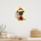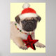 Julutskrift av Pug-valpen med en röd julstjärsformad dekoration i munnen och bär en röd julhatt och färglös helgdag runt hans nacke.