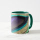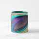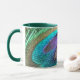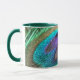 Denna härliga mugg smyckas av en bild av en påfågelfjäder.
