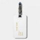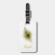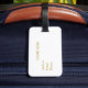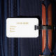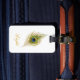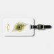 Elegant påfågelsfjäder och kalligrafi på vit bagagetikett.