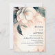 This elegant minimal wedding invitation features 3D faux relief white flower and greenery with a shadow on a blush pink background. First names only text template