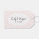 Create personalized tags to decorate wedding favors. These tags are ready to be personalized with a name and date in black lettering inside of white oval-shaped frame. The oval is set against a pink and white checkerboard pattern featuring pretty pink painted squares. The tags have a coordinating pink back.