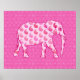 Digitalgrafik i blandat media av en elefant mot en arabesque-ledad bakgrund i mitten - paisley mönster i skuggor av djup till lätt fuchsisk rosa mot blekens bakgrund av isens rosa