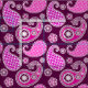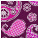 Fabric in an ornate paisley mönster in shades of fuchsia rosa and orchid, accted with white, on a deep amethyst lila bakgrund