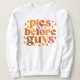 Den här roligten och den slimmade falltemade designen innehåller den lekande frasen "Paj före killar" i ett fet, återinspirerat teckensnitt. Texten är placerad i en kompakt, staplad layout med varje ord i ett annat teckensnitt stil, som skapar en dynamisk och öga-fångstsammansättning. I paletten färg ingår varma autokron som djupa orangar, rik och gyllene gulter, perfekt för att fånga säsongens mysiga viber.