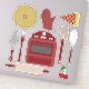 Stickrar med ett rött kökstema i paj, inklusive en spatel, spatel, valstift, ugnmitt, paj-server, vitris, körsbär, paj och paj.