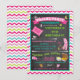 Toppen söt, pajama party med fjädrar, kuddar, musik, pjs, pizza, popcorn och nagel polsh på en schalkboard- och chevronbakgrund. Perfekt för en flickas sömnslumlare party! McBoos illustration av hand plockade.