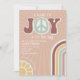 Neutralt babyduschtema med texten "Paket of Joy" med fredstecken inbyggt i designen. Regnbåge rand vid höger och solsken vid grund lämnat med vit text och solbränna/ muterad terracotta bakgrund.