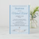 Celebrate your child’s special day with this elegant blue and white watercolor baptism invitation with subtle stripe detail. White flowers rest atop gray tone foliage, with a hand-painted brown cross above the flowers on a pale, blue background, creating a serene and graceful design.