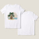 Fun cartoon sketchy illustration of dark green palm silhouettes and a surfboard on sandy beige beach. Playful and energetic tropical vibes, perfect for T-Shirts, Tote Bags, and Stickers.