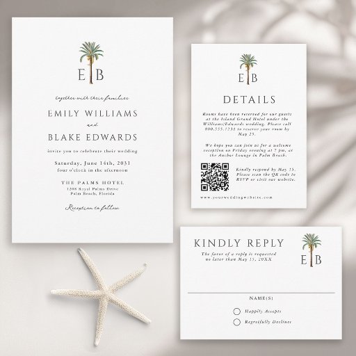 A simple and sophisticated tropical wedding RSVP card that embodies refined Palm Beach style with a modern, minimalist sensibility. A custom royal palm tree monogram anchors the design, featuring the bride and groom’s initials gracefully placed on either side of the palm for a look that feels both personal and polished. Clean typography and airy spacing with a white background creates an upscale elegant aesthetic with tropical warmth with contemporary style. Perfect for a coastal or destination celebration, this response card sets the tone for a stylish, sun-kissed wedding where effortless luxury and thoughtful design take center stage.