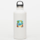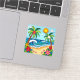 A coastal sticker in a paper quilling style ai illustration of two palm trees, the sun, ocean waves, a beach and tropical flowers.