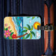 A coastal personalized luggage tag in a paper quilling style ai illustration of two palm trees, the sun, ocean waves, a beach and tropical flowers.