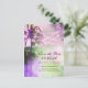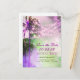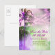 Romantisk vintage sparadatum med rustika gamla palmer, akvarell ombre lila bakgrund och drömmiga strängljus. Perfekt sparadatum postkort för destination och strandbröllop.