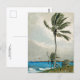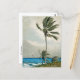 Ett finkonstkort med målningen av den amerikanska konstnären Winslow Homer (1836-1910), Palm Tree, Nassau (1898). Ett landskap med höga palmer som blåser i stormiga förhållanden i Bahamas med en molnig himmel och blått vatten.