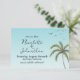 Dessa anpassade Save the Date-kort har ett tropiskt tema för ett destination- eller enkelt strandbröllop. En bild av ett palmträd visas till höger, med en flock fåglar som flyger ovanför. Bakgrunden är en himmelblå gradient. Paret namn skrivs till vänster med en elegant scriptfont, följt av bröllopsdatum och plats.