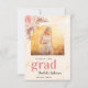 Golden marble skriver ut som bakgrund. Dekoreras med pampasgräs och blommigtar för rosa. Anpassa och lägg till ett eget foto av student. Lägg till år och skola namn. Med ord: Grad skriven med stort brev. Tillbaka: Andra fotot, tackkort-text.